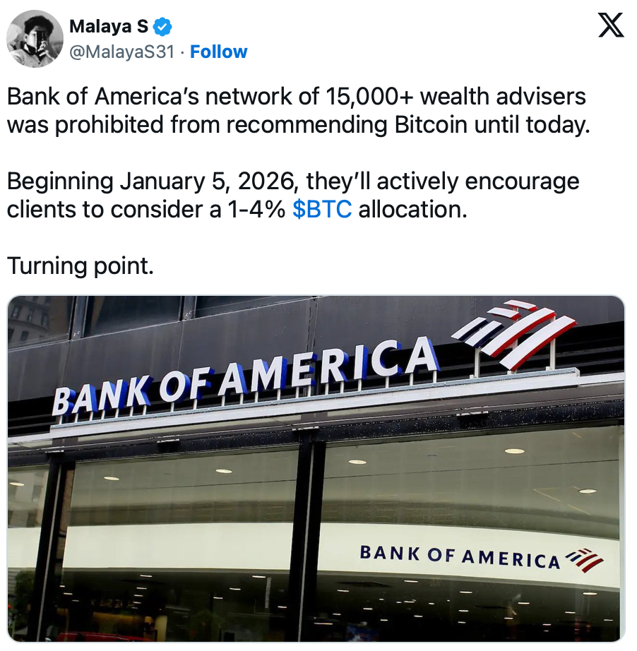 Auch Banken schließen sich der Bewegung an. So erlaubt die Bank of America ihren 15.000 Vermögensberatern ab Januar 2026 erstmals wieder, Bitcoin als Portfolio-Bestandteil zu empfehlen. Diese Richtungsänderung könnte Milliarden an frischem Kapital freisetzen und die institutionelle Nachfrage weiter beschleunigen.