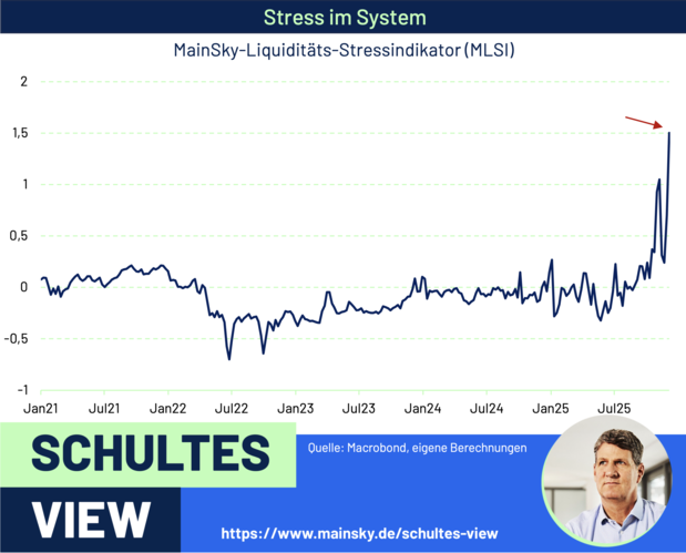 An der hohen Nervosität der Finanzmärkte im November und der bereits seit Mitte Oktober zu beobachtenden Verkaufswelle in stark liquiditätsgetriebenen Marktsegmenten wie Bitcoin, unprofitablen Technologieunternehmen und nicht zuletzt den US Big-Techs, ist auch die Federal Reserve schuld. Sie hat zu lange an "Quantitative Tightening" (QT) festgehalten und damit für eine unnötige Liquiditätsknappheit im System gesorgt. Der MainSky-Liquiditäts-Stressindikator (MLSI) fasst mehrere wichtige Liquiditätsinformationen wie die Reserven der Banken bei der Fed, die Nutzung der Notfall-Repo-Fazilität der Fed und andere in einer Kennzahl zusammen. Bereits im Spätsommer verschärfte sich die Liquiditätssituation, um dann schließlich Mitte Oktober zu eskalieren und jetzt hohen Stress anzuzeigen. Dies fällt zeitlich genau mit dem Beginn des Abverkaufs in den stark liquiditätsgetriebenen Risiko-Assets zusammen.