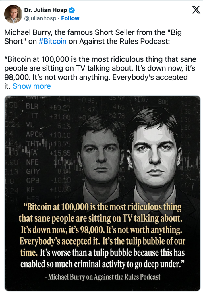 In einer neuen Podcastfolge von "Against the Rules: The Big Short Companion" bewertet Burry die Bewertung von Bitcoin im sechsstelligen Bereich als überzogen. Er argumentiert, dass ein Vermögenswert ohne klaren funktionalen Nutzen langfristig nicht stabil bestehen könne. Die Dynamik erinnere ihn deutlich an die irrationale Preisbildung der Tulpenmanie. Gold sieht er dagegen weiterhin als verlässlichere Form der Wertaufbewahrung - auch wenn er seine Argumente dafür nur knapp umreißt.