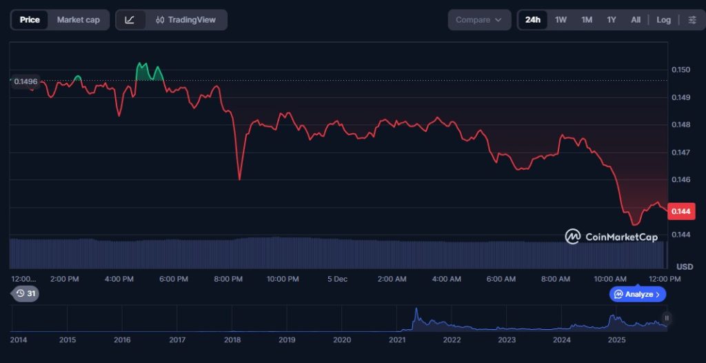 Dogecoin notiert Anfang Dezember 2025 bei etwa 0,145 Dollar. Das Handelsvolumen liegt bei mehr als 1,1 Milliarden Dollar und bestätigt, dass der Coin trotz längerer Seitwärtsphase weiterhin eine der aktivsten Kryptowährungen ist. Die Marktkapitalisierung befindet sich bei rund 23,5 Milliarden Dollar und sichert DOGE einen Platz in den globalen Top 10.