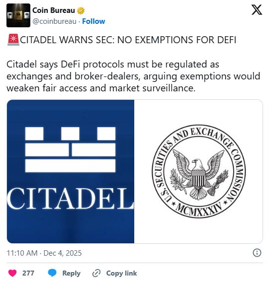 Besonders betont das Unternehmen, dass DeFi-Protokolle funktional wie Börsen handeln, indem sie Handel, Liquidität und Gebührenstrukturen bereitstellen. Für Citadel ist es daher notwendig, diese Systeme denselben regulatorischen Standards zu unterwerfen wie zentrale Marktteilnehmer. Ohne einheitliche Regeln könne laut ihrer Einschätzung langfristige Stabilität nicht garantiert werden.