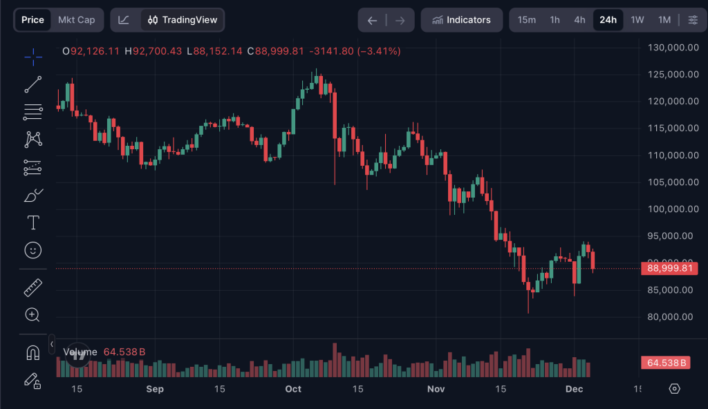 Kurzzeitig sah es so aus, als könnte Bitcoin den Rückfall auf 80.000 US-Dollar schnell ausgleichen. Doch die Gegenbewegung verlor deutlich an Momentum. Der Sprung über 93.000 US-Dollar wurde innerhalb weniger Stunden abverkauft, und inzwischen hat BTC selbst die 90.000-Dollar-Marke wieder unterschritten. Das belastet den gesamten Markt, denn fast alle großen Altcoins geben ihre Gewinne der letzten Woche wieder ab.