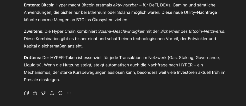 Bei der Analyse verschiedener KI-Modelle ergibt sich ein klares Muster: Immer wieder wird Bitcoin Hyper als einer der vielversprechendsten Altcoins genannt. Auch ChatGPT stuft HYPER als Favoriten ein - und nennt dafür mehrere Gründe. Besonders wichtig ist die Kombination aus Bitcoinkompatibilität und der Leistungsfähigkeit der Solana Virtual Machine.