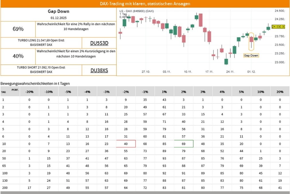 Die Erfolgswahrscheinlichkeiten für das Signal "Gap Down" beruhen auf einer historischen Auswertung des Signals auf den LS-DAX im Zeitraum vom 02.01.2000 bis zum 05.12.2025. Dabei wurden die folgenden Voreinstellungen und Filter vorgenommen: