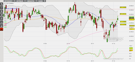 Der DAX befindet sich in einem übergeordneten Aufwärtstrend, welcher am 09. Oktober durch den Kursanstieg auf ein Allzeithoch bestätigt wurde. Anschließend setzte eine Konsolidierung ein. Ausgehend vom Mehrmonatstief vom 21. November bei 22.937 Punkten konnte der DAX wiederum eine Trendfortsetzung einleiten, welche auf der untergeordneten Zeitebene bereits durch steigende Verlaufshochs und -tiefs bestätigt wird. Außerdem wird der Trend derzeit auch durch vier Kaufsignale bestätigt. Insbesondere die gleitenden Durchschnitte der letzten 20, 50 und 200 Börsentage liefern dabei wichtige Kaufsignale. Neben den drei Kaufsignalen des GD 20, GD 50 und GD 200 weist derzeit auch die Slow Stochastik ein Kaufsignal aus. Der Oszillator liefert dabei so lange ein Kaufsignal, wie die grüne Signallinie über der roten Signallinie notiert. Außerdem wurde an den letzten vier Handelstagen jeweils im Vergleich zum Vortag ein höheres Tageshoch und auch ein höheres Tagestief markiert. Diese Tendenz könnte dazu beitragen, dass der Index heute das Tageshoch vom 05. Dezember bei 24.131 Punkten (Widerstand 1) ins Visier nimmt. Sollte dieses Hindernis durchbrochen werden, dann könnten weitere Kursanstiege die Kursentwicklung in den kommenden Tagen in Richtung des oberen Bollinger-Bandes und zum Verlaufshoch vom 12. November bei 24.445 Punkten (Widerstand 2) tendieren lassen. Sollte auch diese Barriere überwunden werden, könnten weitere Kursanstiege in Richtung der Höchststände eingeleitet werden. Impulse erwarten die Anleger heute allen voran durch die Daten zur Industrieproduktion aus Deutschland. Vorbörslich wird der DAX mit einem Kursrückgang von -0,1 % getaxt. Das Long-Szenario ist hinfällig, wenn der DAX unter die Marke von 23.794 Punkten (Unterstützung 2) fällt.