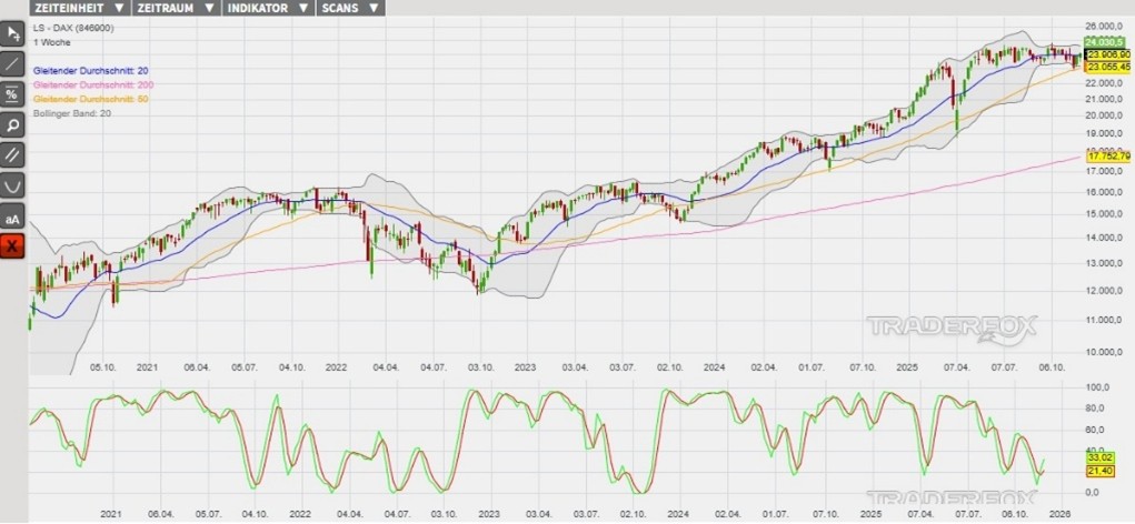 Sollten in dieser Woche Anschlusskäufe erzielt werden, dann könnte das Tageshoch vom 05. Dezember bei 24.131 Punkten (Widerstand 1) überwunden werden. Dieser Etappenschritt könnte weitere Kursanstiege in den Folgetagen in Richtung des sich ausweitenden, oberen Bollinger-Bandes und bis zum Verlaufshoch vom 12. November bei 24.445 Punkten (Widerstand 2) auslösen. Als eine Anlagemöglichkeit in den DAX stehen verschiedene derivative Produkte zur Verfügung. Ein Beispiel ist der ENDLOS TURBO LONG 21.047,69 OPEN END: BASISWERT DAX der DZ BANK (WKN: DU5S3D)* mit einem Basispreis von 21.047,69 Punkten. Der Hebel liegt am 08.12.2025 um 07:00 Uhr bei rund 8,04. Das Long-Szenario ist hinfällig, wenn der DAX nachhaltig unter die Unterstützung bei 23.794 Punkten (Unterstützung 2) fällt. Bitte beachten Sie die Produktrisiken, welche unten im Dokument beschrieben sind.