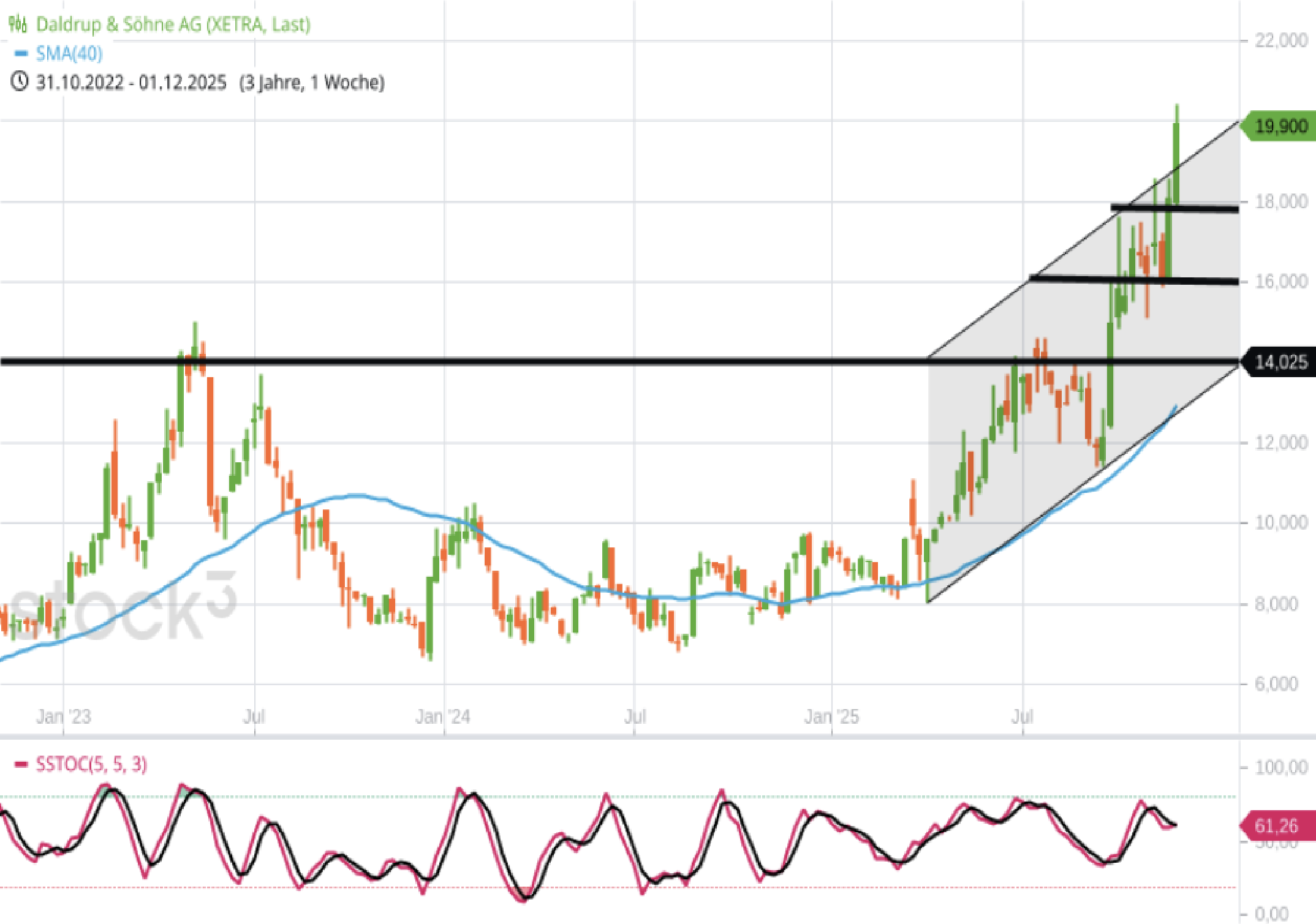 Am vergangenen Donnerstag wurde es verabschiedet, um Genehmigungsverfahren zu vereinfachen und zu beschleunigen. Wenn mehr Bohrungen durchgeführt werden und Geothermie-Anlagen entstehen, profitiert DALDRUP als einziger deutscher Experte auf dem Gebiet. Knapp 50 Mio. € Umsatz wird der Small Cap 2025 erlösen, das Auftragsbuch ist mit 140 Mio. € bereits gut gefüllt. Weitere Aufträge sollten die Visibilität erhöhen. Ziel sind 10 % EBIT-Marge plus X.