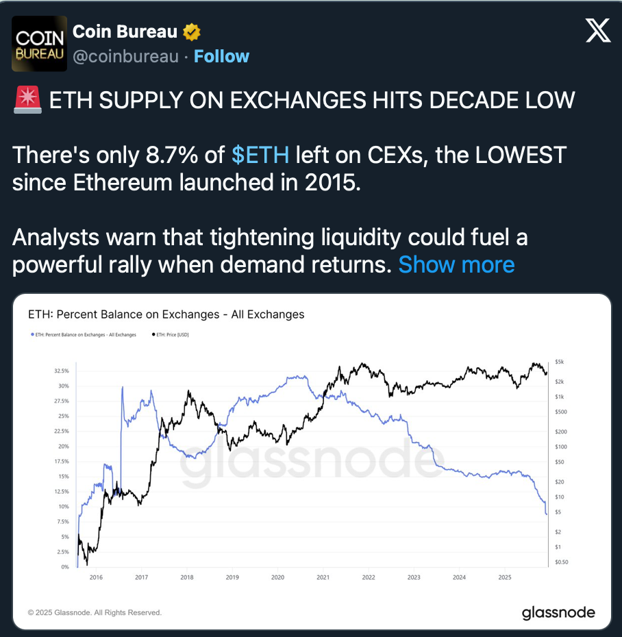 Der Ethereum-Supply auf zentralisierten Börsen ist auf den niedrigsten Stand seit einem Jahrzehnt gefallen. Nur noch 8,7 % des gesamten ETH-Bestands befinden sich auf Exchanges - ein Wert, der deutlicher denn je auf eine strukturelle Verknappung hinweist. Während der Kurs zuletzt unter Druck stand, sendet diese Entwicklung ein stark bullisches Signal, das den mittelfristigen Markt völlig neu bewerten könnte.