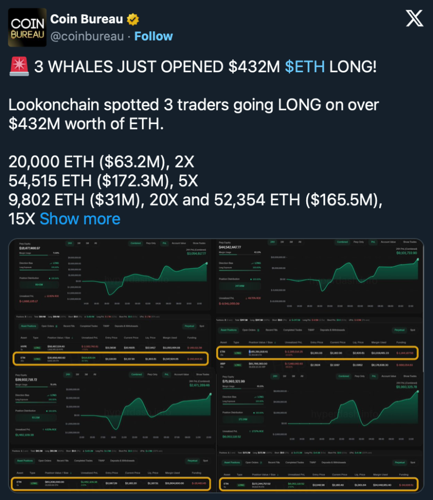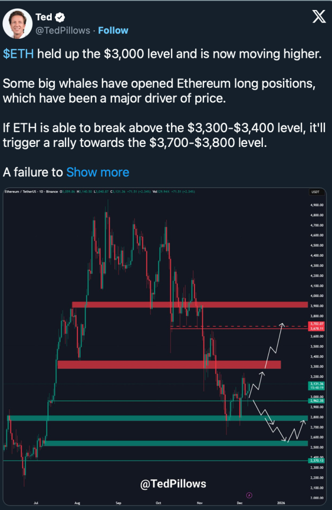 Parallel nutzen Großinvestoren die jüngste Schwächephase zum Einstieg: Drei große Wale eröffneten jüngst Long-Positionen im Wert von insgesamt 432 Millionen US-Dollar. Sie erwarten offenbar, dass ETH sein lokales Tief bereits gefunden hat und sich im Verlauf des Dezembers weiter erholen wird. Analyst Ted Pillows betont allerdings, dass ETH erst über 3.300-3.400 US-Dollar ausbrechen muss, um eine neue Rallyephase einzuleiten.