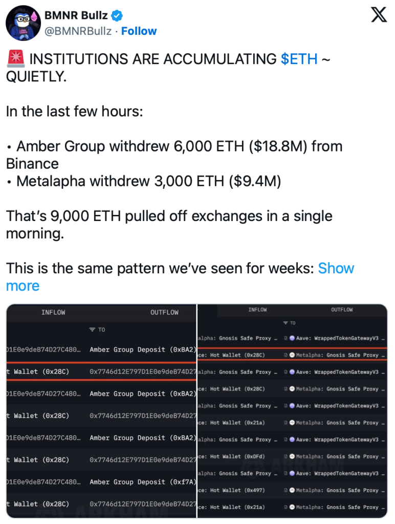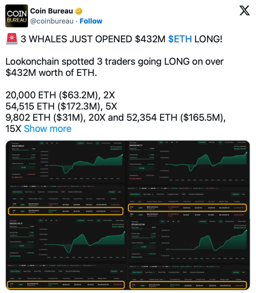 Wale kennen die Zukunft nicht genauer als Privatanleger, doch ihre strategischen Entscheidungen gelten oft als Indikator für Marktstimmung. Und aktuell wird Ethereum in großem Stil gekauft: Drei Großinvestoren eröffneten auf Hyperliquid Long-Positionen im Gesamtwert von 432 Millionen US-Dollar. Parallel zeigen On-Chain-Daten, dass auch institutionelle Anleger die Kursregion um 3.000 US-Dollar aktiv akkumulieren.