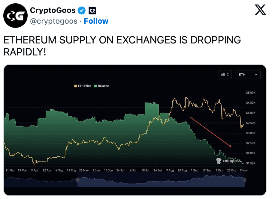 Neben der steigenden Nachfrage sinkt das verfügbare Angebot auf Kryptobörsen rapide. Immer mehr Anleger ziehen ihre Coins ab, was typischerweise ein Zeichen für langfristiges Halten und geringere Verkaufsbereitschaft ist. Ein schrumpfendes Angebot trifft früher oder später auf wieder anziehende Nachfrage - ein Setup, das historisch oft zu explosiven Kursanstiegen führte.