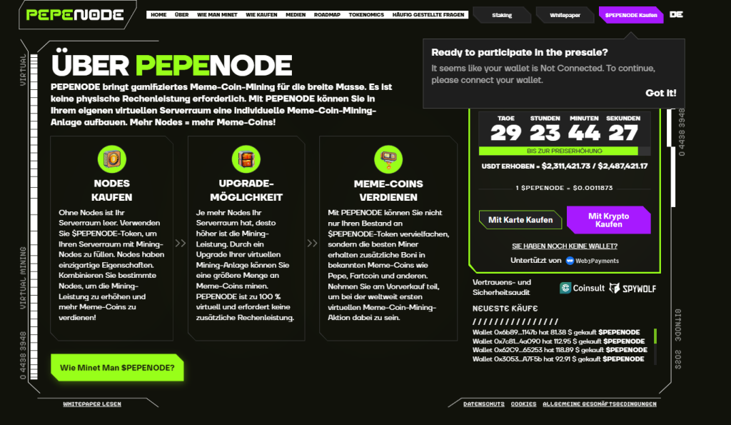 PepeNode kombiniert Meme-Energie mit einem Mine-to-Earn-Ansatz, bei dem Spieler virtuelle Mining-Rigs bauen, Hashrate festlegen und eigene Nodes konfigurieren können. Ausschüttungen erfolgen in Meme-Coins wie PEPE oder FARTCOIN. Die Tokenmechanik gilt als besonders interessant: 70 % der genutzten Token werden geburnt, wodurch das Angebot sinkt, während das Ökosystem wächst. Ergänzend bietet das Projekt attraktive Staking-Renditen - ein Merkmal, das in einem schwachen Marktumfeld zusätzliche Aufmerksamkeit erzeugt.