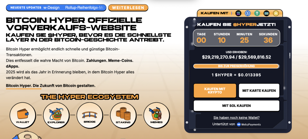 Parallel zur starken Entwicklung auf Ethereum rückt Bitcoin Hyper immer deutlicher in den Blick vieler Marktbeobachter. Das Projekt arbeitet an einer Layer-2-Struktur, die Funktionen ermöglicht, die auf der Bitcoin-Basislayer kaum realisierbar wären. Dazu gehören schnelle Transaktionen, niedrige Gebühren und komplexe Smart-Contract-Anwendungen, die das Bitcoin-Netzwerk deutlich vielseitiger machen könnten.