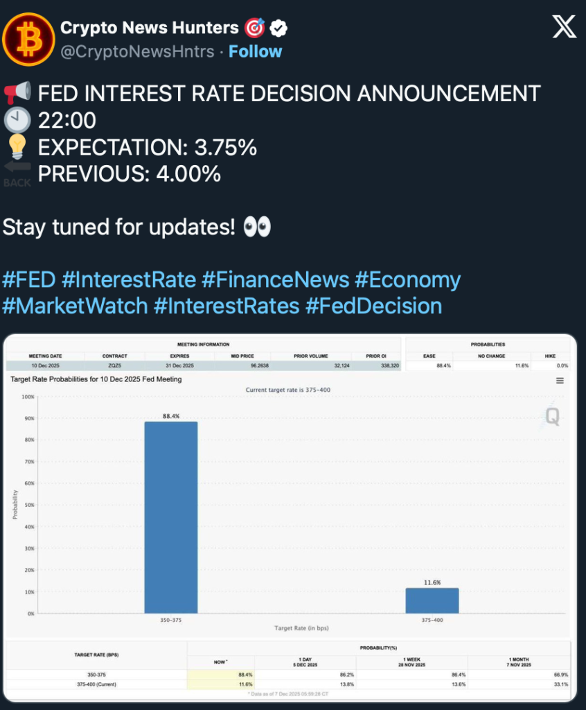 Am morgigen Mittwoch könnte ein wichtiger Impuls für den gesamten Kryptomarkt ausgelöst werden. Nach Abschluss des FOMC-Meetings wird die Federal Reserve bekanntgeben, ob der Leitzins erneut gesenkt wird oder ob die jüngsten Wirtschaftsdaten dagegen sprechen. Viele große Finanzinstitute erwarten eine weitere Reduzierung um 25 Basispunkte, wie zuletzt auch im September und Oktober. Prognosen unter anderem von Morgan Stanley, J.P. Morgan und Standard Chartered untermauern diese Erwartung.