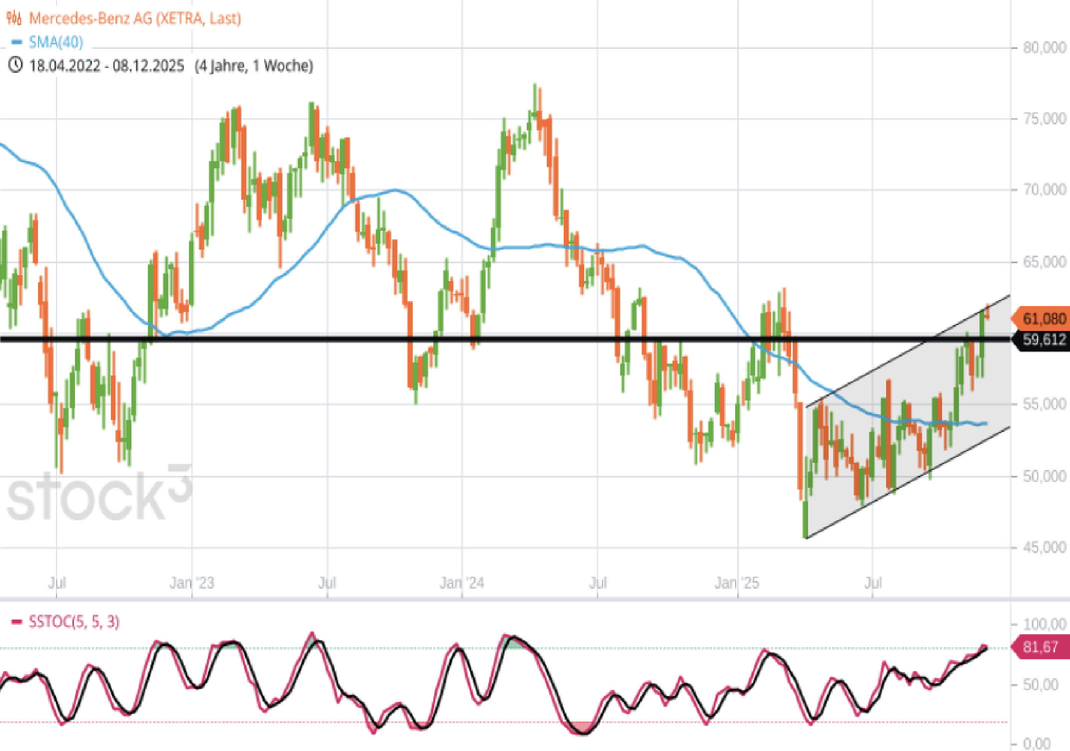 Der Autohersteller kündigte gestern einen Shuttle-Service mit Robotaxis ohne Sicherheitsfahrer auf Basis der neuen S-Klasse an. MERCEDES arbeitet dafür mit dem chinesischen Softwarepartner Momenta zusammen. Der Shuttle-Service soll in Kürze in Abu Dhabi mit ersten Testfahrzeugen starten. Die Robotaxis werden dabei vom lokalen Mobilitätsanbieter Lumo betrieben. Nach Abschluss einer ersten Testphase wollen die Partner den Robotaxi-Service an weiteren Standorten und in anderen Märkten einführen. Die S-Klasse-Taxis bieten autonomes Fahren auf Level-4-Niveau, d. h., sie fahren in festgelegten Gebieten und unter bestimmten Einsatzbedingungen völlig selbstständig. Fazit: MERCEDES-BENZ sendet damit ein starkes Signal, dass man einen wichtigen Zukunftsmarkt nicht komplett der Konkurrenz überlassen will. Die MERCEDES-BENZ-Aktie visiert unterdessen das Jahreshoch 63,17 € an.