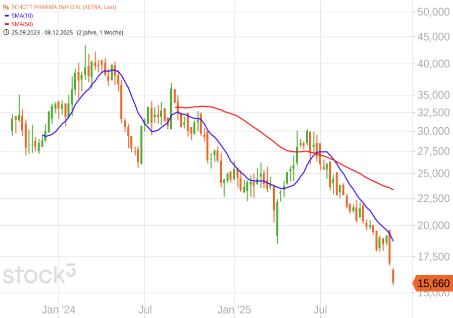 Jetzt erwartet man nur noch ein währungsbereinigtes Umsatzwachstum von 2 bis 5 % und eine EBITDA-Marge von ca. 27 %, während der Markt bisher mit 8 % Wachstum und 29 % Marge kalkuliert hatte. Schott spricht von einem Übergangsjahr 2026, ausgelöst durch Nachfrageschwäche bei Glasspritzen im Segment Drug Delivery Systems (DDS). Die Mittelfristziele 2027 bis 2029 wurden auf 6 bis 8 % Umsatzplus und eine Marge Richtung 30 % gesenkt. Vorläufig stieg 2024/25 der Umsatz 5,8 % auf 986 Mio. € und die EBITDA-Marge auf 28,4 %, EBITDA 280 Mio. €. Analysten senkten zwar ihre Kursziele, blieben aber mehrheitlich optimistisch gestimmt. Der verhaltene Ausblick ließ den Kurs auf ein Rekordtief von 15,84 € fallen. Der Glaubwürdigkeitsbruch belastet kurzfristig, doch bei Stabilisierung der Spritzennachfrage ist nach dem Absturz zumindest technisches Erholungspotenzial vorhanden.