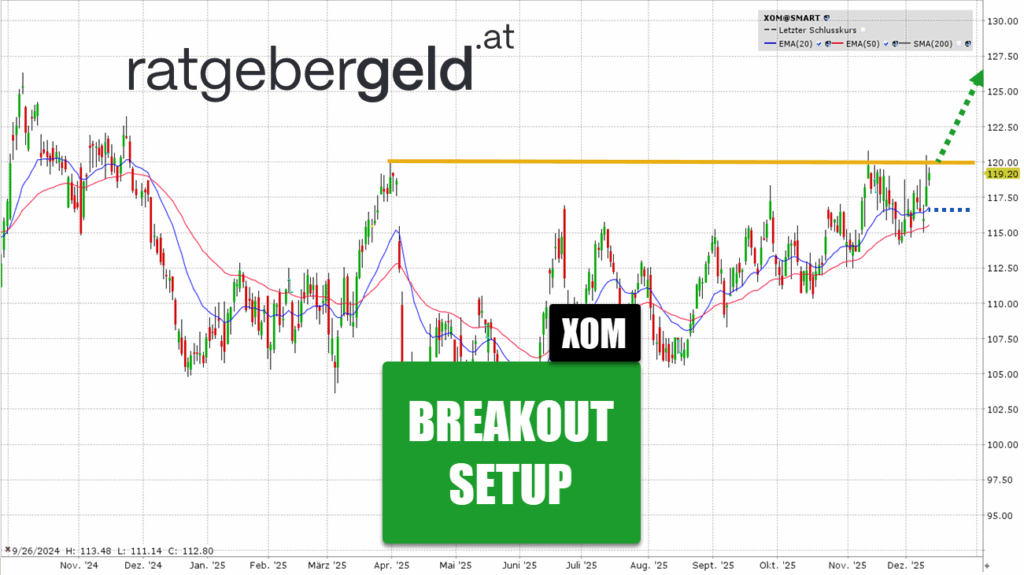 Exxon meldete im letzten Quartal Rekordfördermengen, insbesondere in den Schlüsselregionen Guyana und dem Permian-Becken. Der Chart zeigt eine horizontale Widerstandslinie bei ungefähr 120 USD. Diese Marke hat in den letzten Monaten mehrmals als Obergrenze gewirkt.