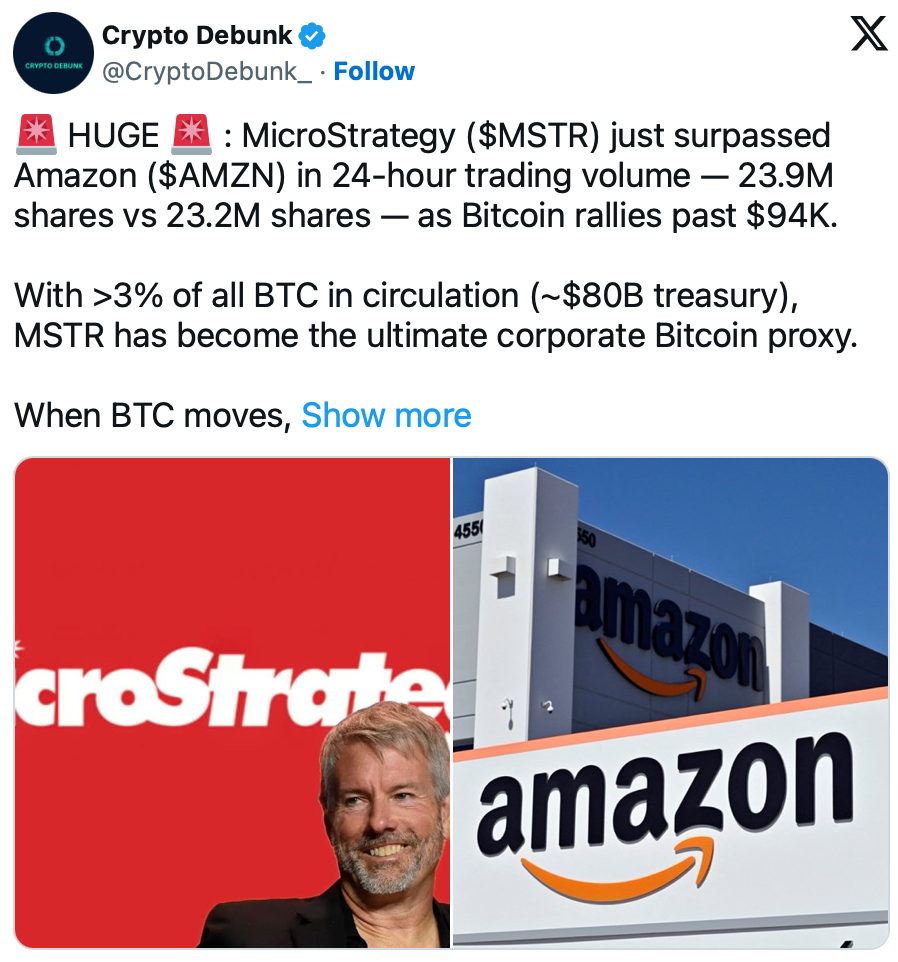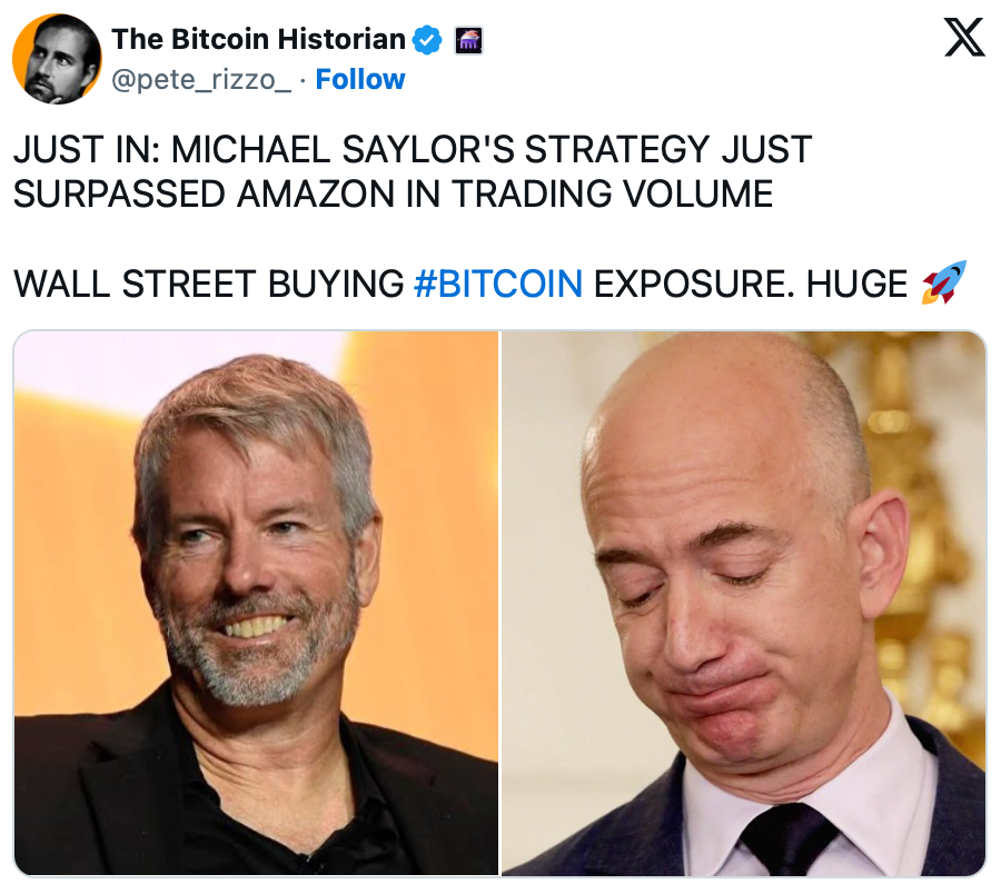 Auch im breiteren Markt wird deutlich, wie außergewöhnlich dieser Trend ist: Wenn ein Unternehmen wie MicroStrategy ein Billionen-Dollar-Unternehmen wie Amazon im Handelsvolumen überholt, signalisiert das eine massive Verschiebung der Kapitalströme hin zu Bitcoin-nahen Instrumenten.
