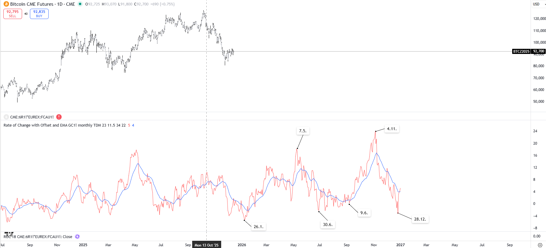 Rückblick: für den 3. Dezember hatte der Forecast das Ende der letzten Abwärtswelle angezeigt. Kurz davor hatte der Markt sein tatsächliches Tief ausgebildet im Bereich um 81.000 Dollar. Nun bekommen wir für 2026 einen ersten starken Kauftermin am (und um den) 26. Januar. Der Bitcoin sollte also im restlichen Dezember und über nahezu den kompletten Januar eine Bodenbildungs-Phase durchlaufen, ehe er sich anschließend aufschwingt.