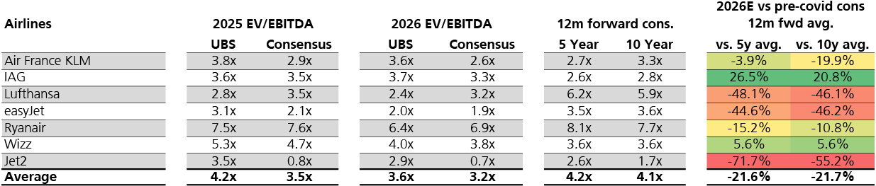Die Bewertungen europäischer Fluggesellschaften liegen derzeit deutlich unter ihren Fünf- und Zehnjahresdurchschnitten auf Basis der EV/EBITDA-Multiples. Das konstatiert die UBS in einer aktuellen Analyse zum Sektor. Führende Marktbeobachter erwarten für 2026 ein Verkehrswachstum zwischen 3 % und 5 %. Airports Council International (ACI) rechnet für Europa mit einem Passagierwachstum von rund 4 % im Jahr 2026. Eurocontrol erwartet ein Wachstum von etwa 3 %, basierend auf dem Ergebnis 2025.IATA prognostiziert für Europa ein Passagierwachstum von rund 3,8 % im Jahresvergleich (global: 4,9 %). Zudem erwartet der Branchenverband einen Anstieg des weltweiten Nettogewinns von 13,2 Mrd. $ auf 14 Mrd. $, bei einer europäischen Nettomarge von rund 4,9 % (EBIT-Marge: 6,9 %).Laut UBS geben positives Wirtschaftswachstum, nachlassende Inflationsrisiken und ein insgesamt stabileres makroökonomisches Umfeld Rückenwind. Die UBS-Bewertungen im Überblick: