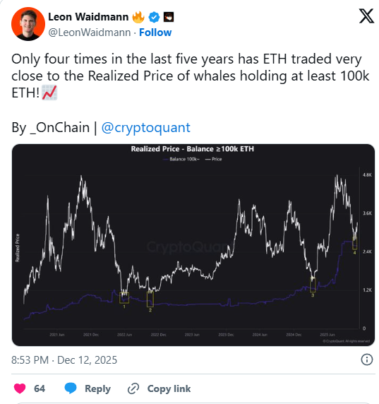Weitere On-Chain-Daten zeigen, dass sich der aktuelle ETH-Kurs in unmittelbarer Nähe der Einstiegspreise großer Wallets bewegt. Adressen mit Beständen von mehr als 100.000 ETH haben ihre Positionen nur knapp unter dem aktuellen Kursniveau aufgebaut. In der Vergangenheit folgten auf das Erreichen dieser Zone häufig kräftige Aufwärtsbewegungen.
