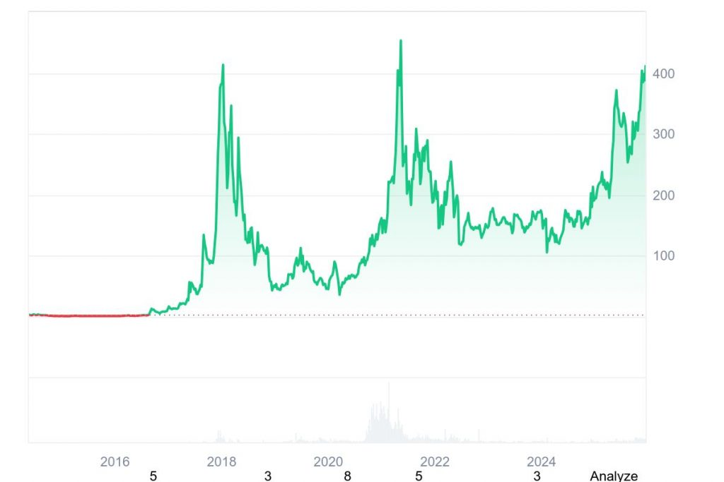 Vor wenigen Tagen gelang XMR erstmals der Ausbruch über die Marke von 400 US-Dollar. Ein anschließender Retest dieses Niveaus verlief erfolgreich, ohne dass der Kurs deutlich darunter zurückfiel. Stattdessen zog der Preis erneut an. Aktuell notiert Monero bei rund 411 US-Dollar, was einem Tagesplus von etwa 2 Prozent entspricht. Die Marktkapitalisierung liegt damit bei rund 7,6 Milliarden US-Dollar, womit XMR derzeit auf Rang 16 der größten Kryptowährungen steht - knapp vor Zcash.