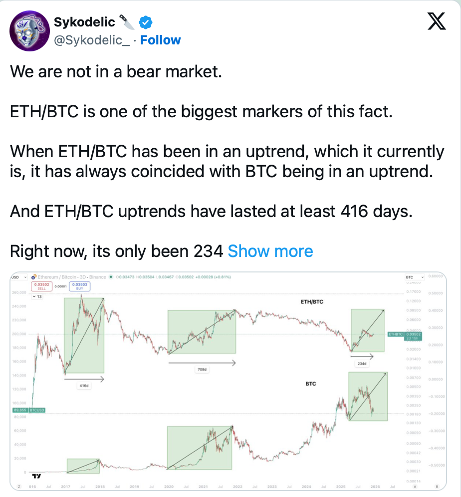 Historisch gilt der ETH/BTC-Chart als einer der zuverlässigsten Marker zur Einschätzung der allgemeinen Marktstimmung. In allen Phasen, in denen Ethereum gegenüber Bitcoin an Stärke gewann, befand sich der gesamte Kryptomarkt in einem Aufwärtstrend. Diese Phasen hielten in der Vergangenheit meist über 416 Tage an.