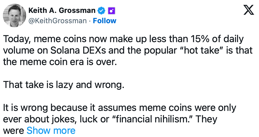Ein bekannter Gründer und Entwickler widerspricht der These vom Ende der Memecoins deutlich. Seiner Ansicht nach basiert diese Sichtweise auf der Annahme, Memecoins seien nie mehr gewesen als Witze oder zufällige Spekulationsobjekte ohne tieferen Wert.