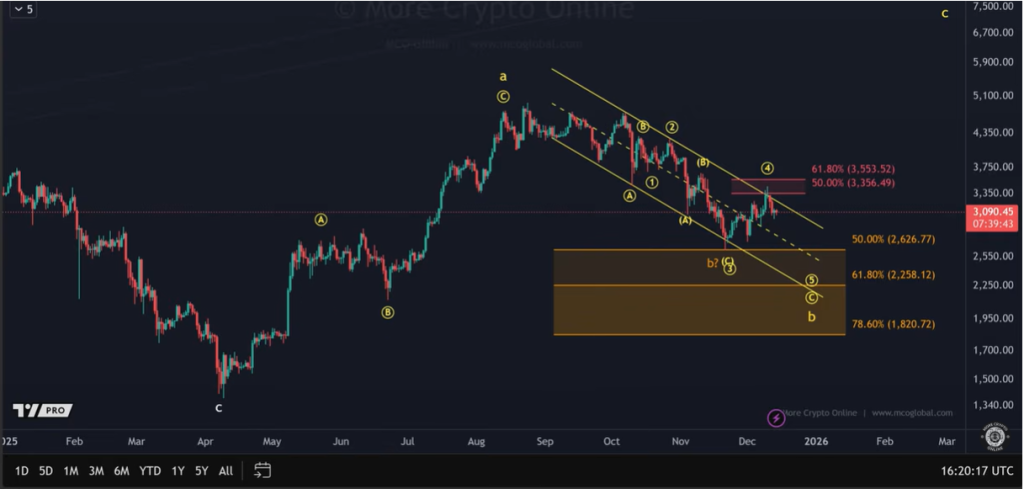 Zuletzt lief der Kurs wie erwartet in den Bereich um 3.350 US-Dollar, wo das 50-%-Retracement der vorherigen Abwärtsbewegung erreicht wurde. Dieser Bereich fungiert als erster relevanter Widerstand. Der anschließende Rücklauf fügt sich sauber in das übergeordnete Bild ein. Auch die jüngste Aufwärtsbewegung wirkt erneut dreiteilig - ein weiteres Indiz für eine Zwischenbewegung und nicht für den Start eines impulsiven Weihnachtstrends.