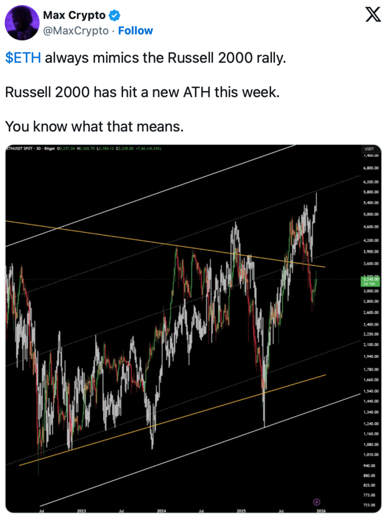 Ein oft unterschätzter Frühindikator für den Kryptomarkt ist die Entwicklung von US-Nebenwerten. Der Russell 2000, der rund 2.000 kleinere US-Unternehmen abbildet, hat zuletzt ein neues Allzeithoch erreicht.