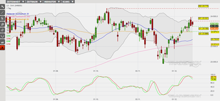 Nachdem der DAX sich am 21. November noch am unteren Bollinger-Band stabilisieren konnte, hat eine dynamische Aufwärtsbewegung den Index bis zum 12. Dezember temporär in den überkauften Bereich über das obere Bollinger-Band geführt. Diese Dynamik hat auch die Signallinien temporär bis in den überkauften Bereich mit Werten von über 80 Punkten geführt. Zum Abbau der überkauften Marktlage wurde dann eine technische Gegenreaktion eingeleitet. Diese wird momentan durch ein Verkaufssignal in der Slow Stochastik bestätigt.