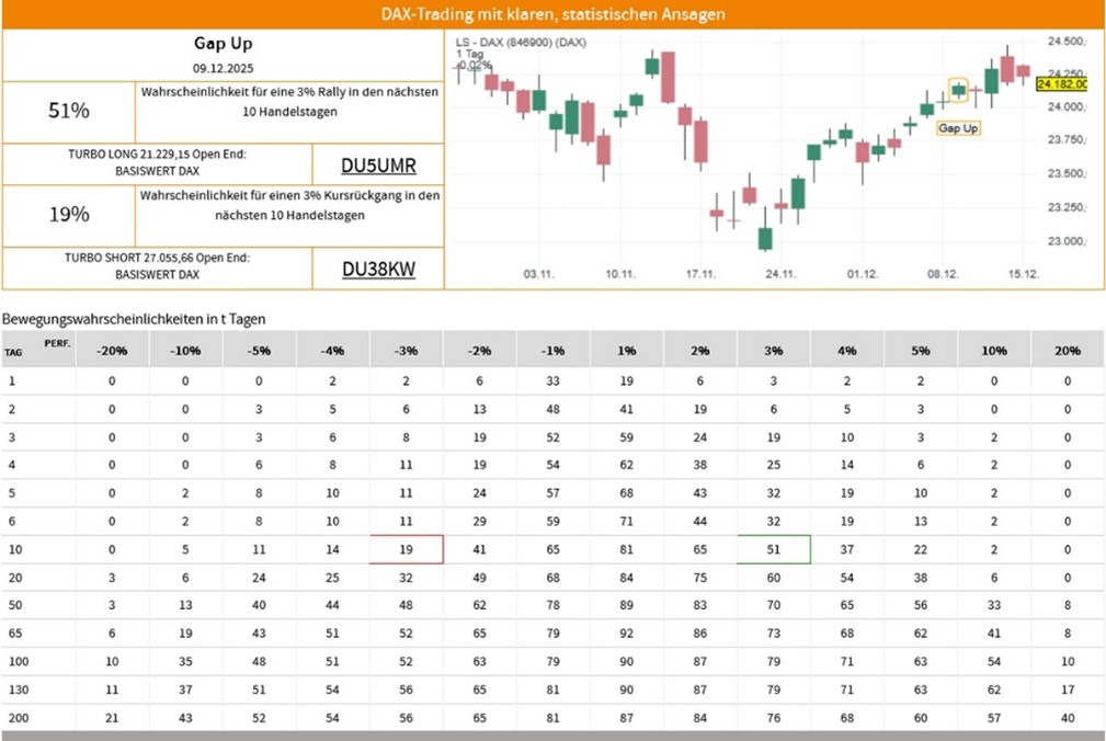 Die Erfolgswahrscheinlichkeiten für das Signal "Gap Up" beruhen auf einer historischen Auswertung des Signals auf den LS-DAX im Zeitraum vom 02.01.2000 bis zum 15.12.2025. Dabei wurden die folgenden Voreinstellungen und Filter vorgenommen: