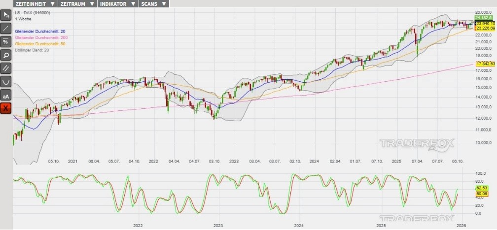 Charttechnisch könnte der DAX nach einer temporären Konsolidierung die Trendfortsetzung forcieren. In diesem Szenario markiert das Tageshoch vom 15. Dezember bei 24.331 Punkten (Widerstand 1) die erste Barriere. Der Kursanstieg über dieses Hindernis könnte wiederum Anschlusskäufe bis zum sich ausweitenden, oberen Bollinger-Band begünstigen. Die zweite Hürde lokalisiert anschließend das Allzeithoch vom 09. Oktober bei 24.775 Punkten (Widerstand 2). Der Ausbruch auf neue Bestmarken würde wiederum ein prozyklisches Kaufsignal erzeugen. Als eine Anlagemöglichkeit in den DAX stehen verschiedene derivative Produkte zur Verfügung. Ein Beispiel ist der ENDLOS TURBO LONG 21.229,15 OPEN END: BASISWERT DAX der DZ BANK (WKN: DU5UMR)* mit einem Basispreis von 21.229,15 Punkten. Der Hebel liegt am 16.12.2025 um 07:00 Uhr bei rund 8,14. Das Long-Szenario ist hinfällig, wenn der DAX nachhaltig unter die Unterstützung bei 23.996 Punkten (Unterstützung 2) fällt. Bitte beachten Sie die Produktrisiken, welche unten im Dokument beschrieben sind.