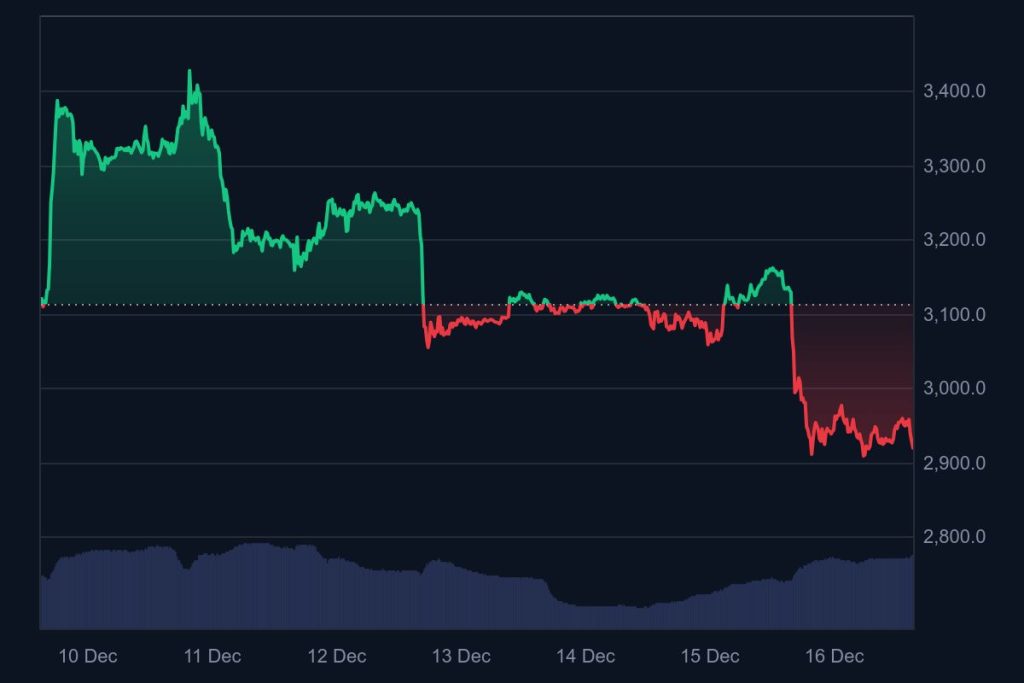 Die 3.000-Dollar-Zone ist nicht magisch, aber psychologisch enorm wichtig. Rund um solche runden Marken sammeln sich Stops, Limit-Orders und viel "Ich entscheide dann"-Liquidität. Am 16. Dezember zeigte sich, wie schnell der Ethereum Kurs darunter in einen klaren Abwärtsmodus kippen kann: ETH/USDT lag bei etwa 2.898,78 US-Dollar, mit einer 24-Stunden-Bewegung von minus 7,09 Prozent.