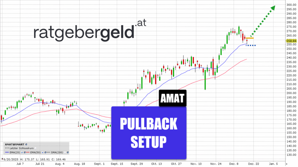 Applied Materials ist ein Anbieter von Ausrüstung, Dienstleistungen und Software für die Herstellung von Halbleitern. Das Unternehmen entwickelt Maschinen für die Chip-Produktion (z.B. für Wafer-Beschichtung und Ätzprozesse). Besonders stark ist man aktuell im Bereich KI-Chips, High-Performance-Computing und modernen Speicherlösungen (DRAM/NAND). Fundamental steht Applied Materials auf einem sehr starken Fundament. Erst vor wenigen Tagen kündigte das Board eine Quartalsdividende von 0,46 USD pro Aktie an. Im Jahr 2025 hat das Unternehmen insgesamt ca. 6,3 Mrd. US-Dollar durch Dividenden und Aktienrückkäufe an die Aktionäre zurückgegeben.