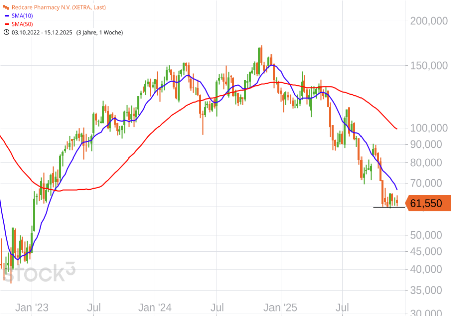 Angeblich will DM bereits ab dieser Woche rezeptfreie Medikamente online anbieten und aus Tschechien versenden. Grundlage ist ein Handelsblatt-Interview mit DM-Chef Christoph Werner, der betonte, dass DM keine Rezepte einlösen werde. Der geplante Einstieg ist seit Monaten ein Belastungsfaktor für Redcare. Vor einem Jahr hatte die Aktie wegen der Fantasie rund um das E-Rezept noch über 170 € notiert, inzwischen bewegt sie sich nahe 60 € und hat sich damit fast gedrittelt. Redcare bleibt beim Versand rezeptpflichtiger Arzneien im Vorteil, doch der Einstieg von DM erhöht den Preisdruck im Wachstumsmarkt spürbar. Mit dem operativen Marktstart von DM würde aus einer Drohung ein realer Wettbewerber werden.