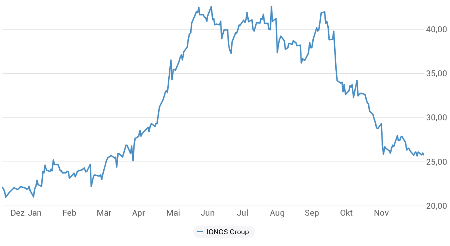 Der Webhoster peilt für das laufende Jahr jetzt eine bereinigte Ebitda-Marge von 36,5 % (zuvor: 35 %) an. Zugleich rechnet Ionos-Chef Achim Weiß für 2025 nur noch mit einem währungsbereinigten Umsatzplus von 6 % (zuvor: 8 %). Das Ziel für den operativen Gewinn (bereinigtes Ebitda: + 17 % auf 480 Mio. €) blieb unverändert. Für 2026 erwartet Weiß ein Umsatzplus von 7 % und einen Anstieg des operativen Gewinns um 10 % auf 530 Mio. €. Dazu beitragen soll ein verstärktes Up- und Cross-Selling an die rund 6,6 Mio. Bestandskunden. Zugleich will Ionos die Kundenzahl weiter steigern. Auf die angepasste Prognose reagierte der MDax-Titel gestern zeitweise mit Minus von 3,3 %, bevor eine Kursstabilisierung einsetzte.
