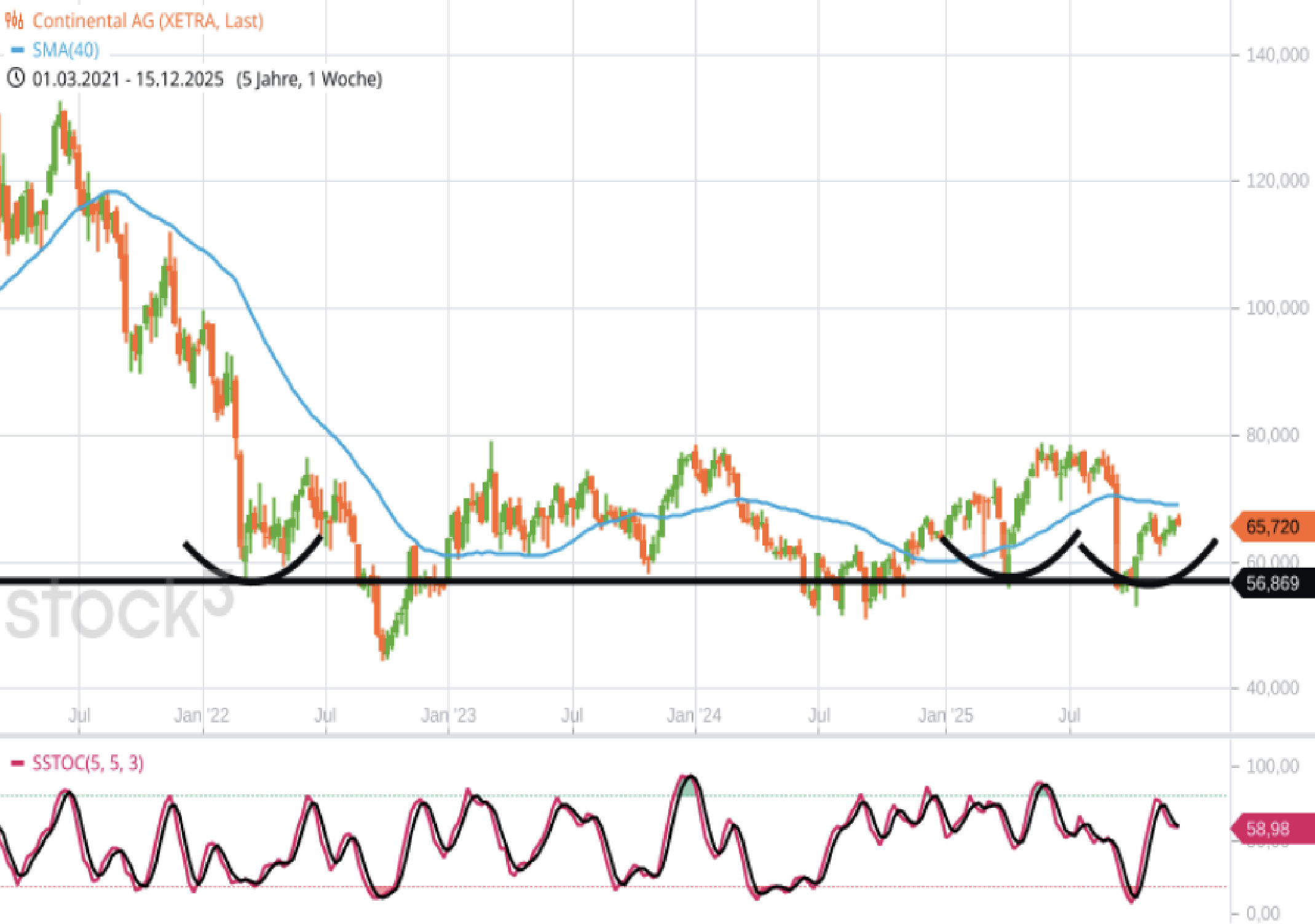 Der bisherige CEO Nikolai Setzer gibt die Führung zum Jahreswechsel ab, Nachfolger wird der bisherige Reifenchef Christian Kötz. Der Wechsel folgt der weit vorangeschrittenen Neuaufstellung und der Fokussierung auf das Reifengeschäft. CONTINENTAL hat die Autozuliefersparte abgespalten und als AUMOVIO an die Börse gebracht, 2026 soll zudem die Kunststoffteilesparte ContiTech verkauft werden, die internen Vorbereitungen gelten als weitgehend abgeschlossen. Damit wird CONTINENTAL zum reinen Reifenhersteller. Aufsichtsratschef Wolfgang Reitzle betont, dass Reifen, Neuaufstellung und Konzernfunktionen nun in einer Hand liegen. JEFFERIES bestätigte gestern die Einschätzung "Buy" mit 75 € Kursziel und sieht bei schwacher Nachfrage Vorteile für lokale Produzenten wie CONTINENTAL und MICHELIN, denn Aussagen des Kautschukproduzenten SRI Trang zu rückläufigen Volumina und schwacher Nachfrage deuteten auf niedrigere EU- und US-Importe hin, so JEFFERIES. Fazit: Der CEO-Wechsel setzt den strategischen Schlusspunkt hinter die Transformation zum fokussierten Reifenplayer.