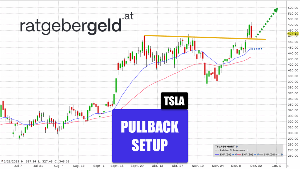 Der Tesla-Chart zeigt ein hochinteressantes Pullback Setup nach einem massiven Ausbruch. Seit September befindet sich Tesla in einem starken Bullenmarkt, getrieben von Fortschritten bei KI und Robotaxis. Die Aktie hat die markante Widerstandszone bei ca. 468 USD dynamisch nach oben verlassen und sprang auf ein neues Allzeithoch.