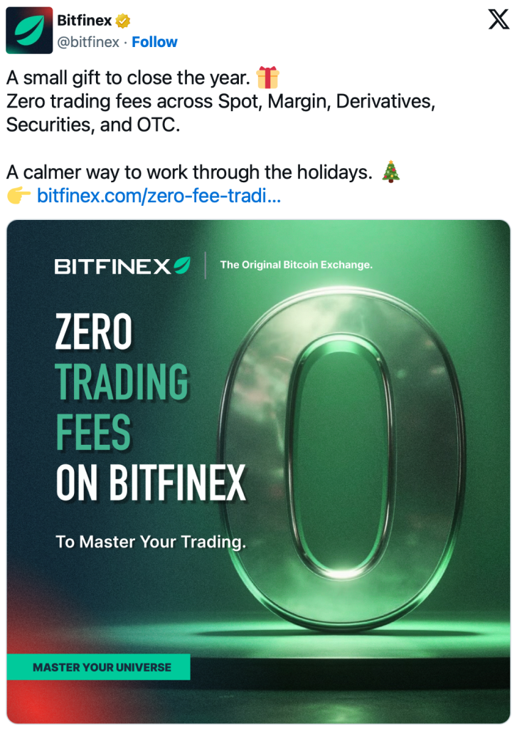 Kurz vor Jahresende sorgt die Kryptobörse Bitfinex mit einem ungewöhnlichen Schritt für Aufmerksamkeit. Die Plattform hat sämtliche Handelsgebühren auf null gesetzt und zwar über alle Bereiche hinweg. Diese Entscheidung fällt in eine Phase geringer Marktaktivität und soll Tradern ein einfacheres und kosteneffizienteres Management ihrer Positionen während der Feiertage ermöglichen. Gleichzeitig sendet Bitfinex damit ein klares Signal an den Gesamtmarkt.