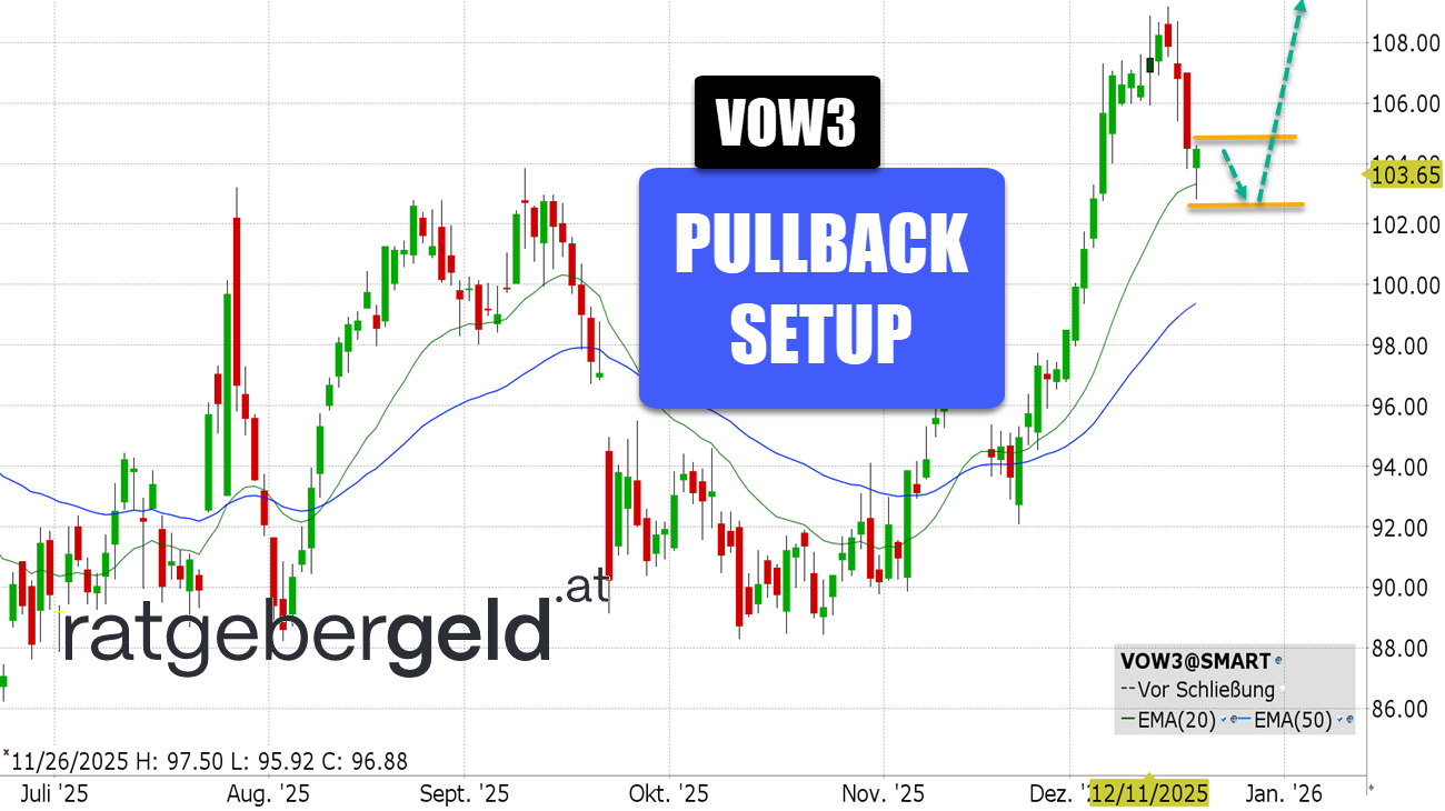 Die viel diskutierte Entscheidung der EU, das Verbrenner-Aus ab 2035 aufzuweichen, bringt Volkswagen-unterm Strich gar nichts. Zwar sollen künftig statt null Emissionen nur noch 90 Prozent vorgeschrieben sein und Schlupflöcher wie E-Fuels oder Kompensationen offenbleiben, doch der Konzern hat sich strategisch längst auf Elektromobilität festgelegt und zieht diesen Kurs unabhängig vom Brüsseler Zickzack durch. Ab April geht Volkswagen mit dem ersten vollelektrischen Polo an den Start. Mit einem Einstiegspreis von rund 25.000 Euro zielt der Konzern nicht auf eine elitäre Nische, sondern auf den Massenmarkt. Damit wird der E-Polo für breite Käuferschichten bezahlbar und kann preislich problemlos mit den aggressiv kalkulierten Kleinwagen aus China und Korea mithalten. Mit eigenen Batteriezellfabriken, etwa in Salzgitter, und dem Ziel, sich von China unabhängiger zu machen, positioniert sich der Konzern langfristig als einer der letzten ernstzunehmenden europäischen Autoplayer. Analysten sehen VW deshalb nicht als Profiteur politischer Gnadenakte, sondern als Unternehmen, das seinen Weg ohnehin geht. Natürlich bleiben die globalen Rahmenbedingungen schwierig, aber mit dem Tritt auf die Kostenbremse könnte die Wettbewerbsfähigkeit zurückgewonnen werden. Somit untermauert die klare Strategie, die charttechnisch bullische Einschätzung.