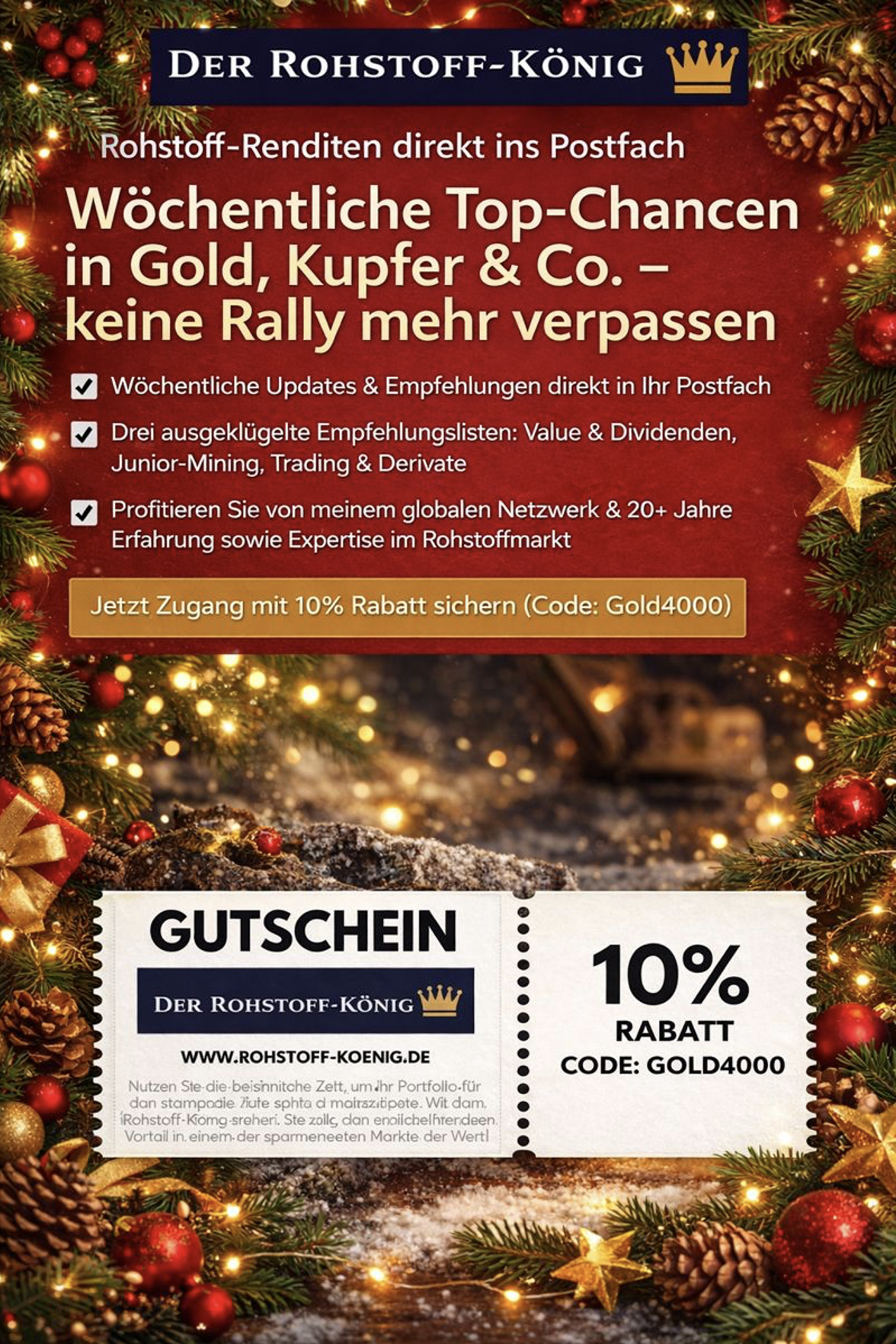 Dies ist eine Anzeige/Werbung. Keine Anlageberatung, keine Aufforderung zum Kauf/Verkauf von Finanzinstrumenten. Interessenkonflikt: Der Ersteller erhält Vergütung; es können Positionen in besprochenen Werten bestehen. Risiken: Rohstoff- & Small-Cap-Investments sind hoch volatil; Totalverlust möglich. Vergangene Erfolge/"Trefferquoten" sind kein Indikator für zukünftige Ergebnisse. Aktualisierungs-/Methodik-Hinweise siehe Impressum/Website.