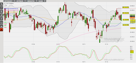 Der DAX konnte mit der Etablierung eines Mehrmonatstiefs am 21. November und der gleichzeitigen Kursstabilisierung am unteren Bollinger-Band die Basis für die Fortsetzung des langfristigen Aufwärtstrends legen. Es folgte bis zum 12. Dezember eine dynamische Aufwärtsbewegung, welche den Index bis in den überkauften Bereich über das obere Bollinger-Band geführt hat. Eine technische Gegenreaktion hatte den Index daraufhin zurück zum gleitenden Durchschnitt der letzten 50 Börsentage (= GD 50) geführt. Dieser konnte an den letzten beiden Tagen erfolgreich verteidigt werden, wodurch die Basis für die nächste Aufwärtswelle gelegt worden sein könnte. Ein solches Szenario wird derzeit durch die Kaufsignale der gleitenden Durchschnitte der letzten 20, 50 und 200 Börsentage (= GD 20, GD 50 und GD 200) bestätigt. Weitere Kursanstiege könnten dazu beitragen, dass auch die grüne Signallinie der Slow Stochastik wieder über die rote Signallinie steigt. Hierdurch würde auch der Oszillator wieder ein bestätigendes Kaufsignal erzeugen. Im Szenario der Trendfortsetzung markiert das Tageshoch vom 18. Dezember bei 24.214 Punkten (Widerstand 1) die erste Hürde. Der Kursanstieg über diese Barriere könnte wiederum Anschlusskäufe bis zum lokalen Maximum vom 12. Dezember bei 24.475 Punkten (Widerstand 2) und dem oberen Bollinger-Band auslösen. Impulse erwarten die Anleger heute insbesondere durch den großen Verfallstag auf dem Terminmarkt. Außerdem stehen Wirtschaftsindikatoren wie der deutsche Erzeugerpreisindex und das GfK Konsumklima für Deutschland auf der Agenda. Vorbörslich wird der DAX mit einem Kursrückgang von -0,3 % getaxt. Das Long-Szenario ist hinfällig, wenn der DAX unter die Marke von 23.794 Punkten (Unterstützung 2) fällt.
