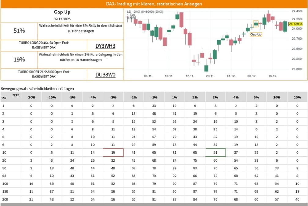 Die Erfolgswahrscheinlichkeiten für das Signal "Gap Up" beruhen auf einer historischen Auswertung des Signals auf den LS-DAX im Zeitraum vom 02.01.2000 bis zum 18.12.2025. Dabei wurden die folgenden Voreinstellungen und Filter vorgenommen: