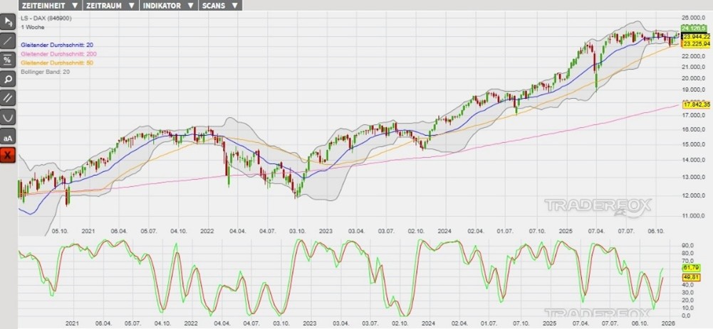 Charttechnisch könnte der DAX mit dem Überschreiten des Tageshochs vom 18. Dezember, welches bei 24.214 Punkten (Widerstand 1) markiert wurde, die Trendfortsetzung in Richtung des oberen Bollinger-Bandes einleiten. In diesem Szenario markiert das lokale Maximum vom 12. Dezember bei 24.475 Punkten (Widerstand 2) die nächste charttechnische Barriere. Als eine Anlagemöglichkeit in den DAX stehen verschiedene derivative Produkte zur Verfügung. Ein Beispiel ist der ENDLOS TURBO LONG 20.464,64 OPEN END: BASISWERT DAX der DZ BANK (WKN: DY3WH3)* mit einem Basispreis von 20.464,64 Punkten. Der Hebel liegt am 19.12.2025 um 07:00 Uhr bei rund 6,56. Das Long-Szenario ist hinfällig, wenn der DAX nachhaltig unter die Unterstützung bei 23.794 Punkten (Unterstützung 2) fällt. Bitte beachten Sie die Produktrisiken, welche unten im Dokument beschrieben sind.