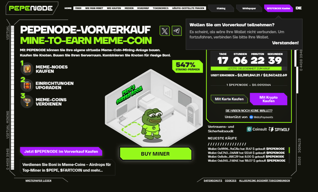PEPENODE hat eine feste Menge von 210 Milliarden Token, ein Großteil eingesetzter Tokens wird verbrannt, Emissionen reduzieren sich über Zeit. Der Presale läuft noch rund 17 Tage bei 0,0012064 US-Dollar pro Token vor Listing.
