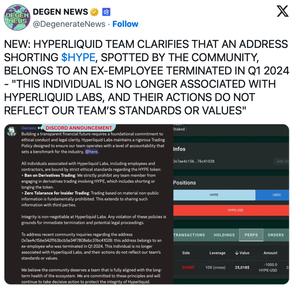 Die betreffende Wallet-Adresse gehört einem ehemaligen Mitarbeiter, der im ersten Quartal 2024 ausgeschieden ist. Diese Person steht in keiner Verbindung mehr zu Hyperliquid Labs, und ihre Aktivitäten widerspiegeln nicht die Werte des aktuellen Teams.