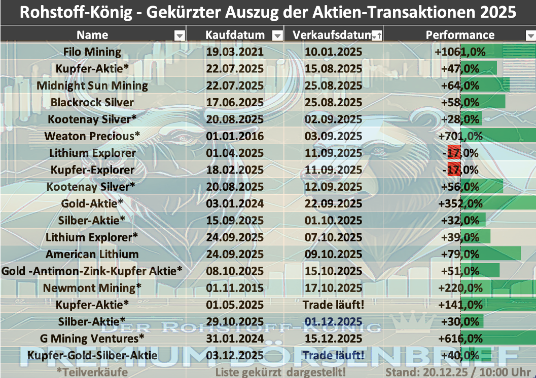 Wer 2026 nicht zuschauen will, sondern mit klaren Ein- und Ausstiegen arbeiten möchte, braucht vor allem eines: einen Prozess. Genau das ist der Kern des Rohstoff-Königs - und genau deshalb ist ein Jahresrückblick wie dieser mehr als ein Rückspiegel: Er ist die Einladung, das nächste Jahr von Beginn an aktiv mitzuspielen.
