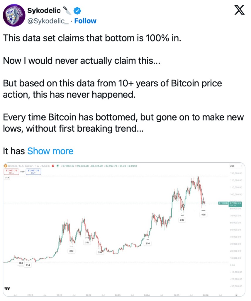Ein Analyst begründet seine bullische Einschätzung mit einem datenbasierten Muster aus über zehn Jahren Bitcoin-Kursgeschichte. Nach lokalen Tiefpunkten fiel Bitcoin historisch immer innerhalb von maximal 35 Tagen tiefer, ohne vorherigen Trendbruch nach oben.