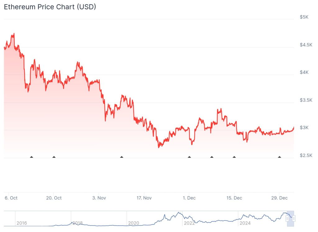 Ethereum bewegt sich seit Wochen in einer engen Range zwischen 2.800 und 3.000 US-Dollar nach einem dreimonatigen Abwärtstrend mit fast 30 Prozent Verlust. Diese Zone liegt im Zentrum eines mehrjährigen Aufwärtskanals und diente historisch als Unterstützung oder Widerstand.